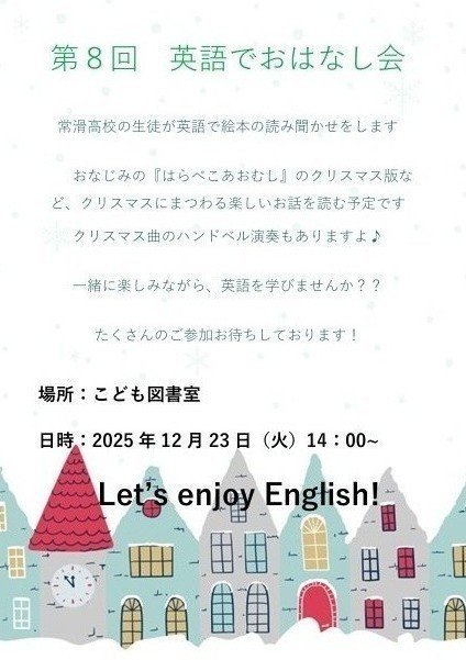 第8回 英語でおはなし会 投稿日: 2025年12月18日 こども図書室 開催期間:2025年12月23日 常滑高校の生徒さんが「英語でおはなし会」を開催します!ぜひお越しください。 前の記事 次の記事