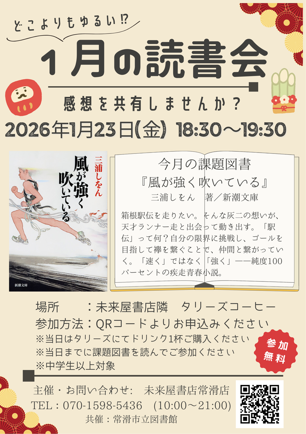 【未来屋書店常滑店】1月の読書会 投稿日: 2025年12月27日 その他 開催期間:2026年1月23日 場所はイオンモール常滑店の未来屋書店です!お間違いないようお越しください。 前の記事 次の記事