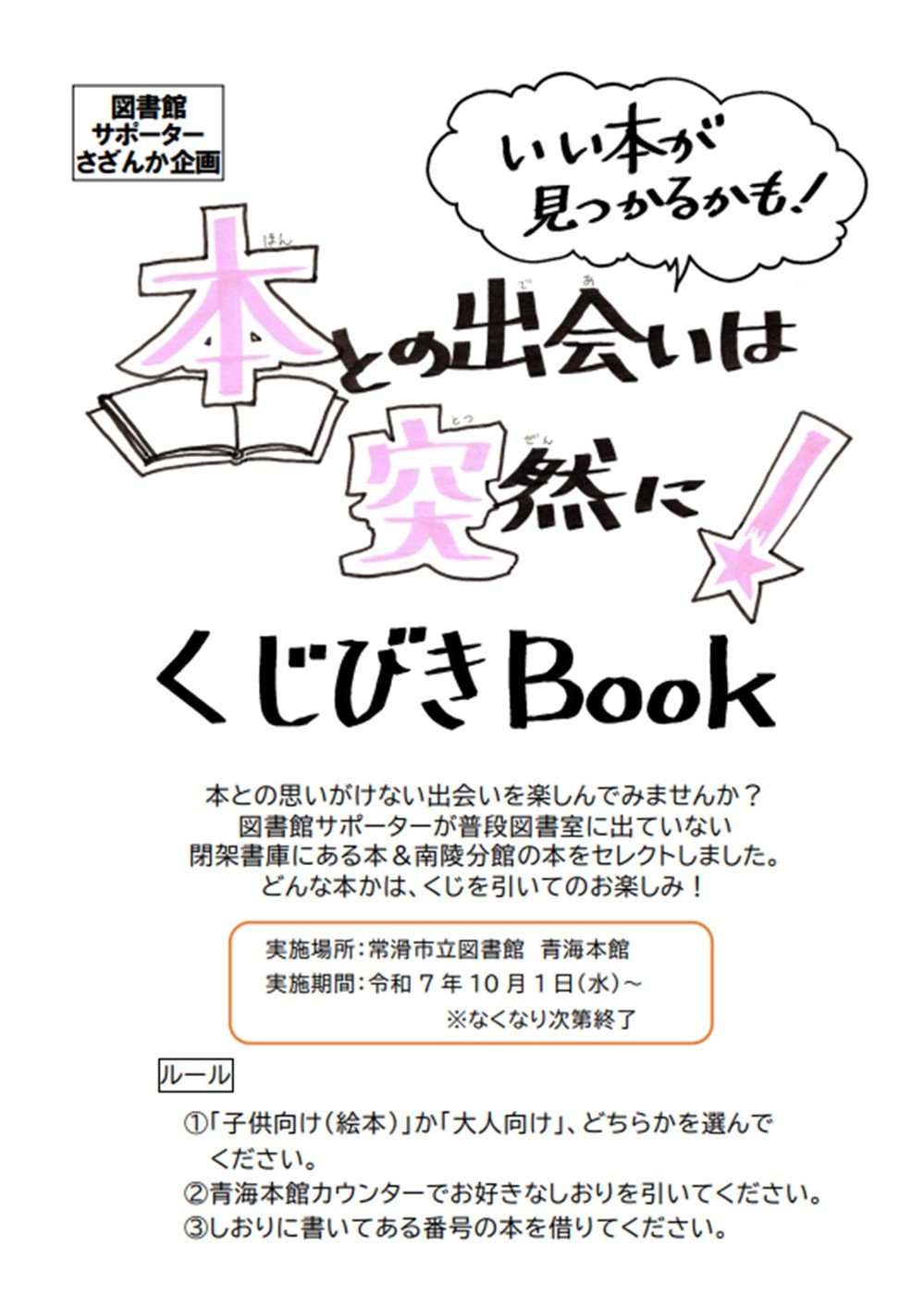 【図書館サポーター企画】くじびきBook 投稿日: 2025年9月23日 青海本館 開催期間:2025年10月 1日 今年も図書館サポーターさざんかさんが企画します!ぜひご参加ください。 前の記事 次の記事