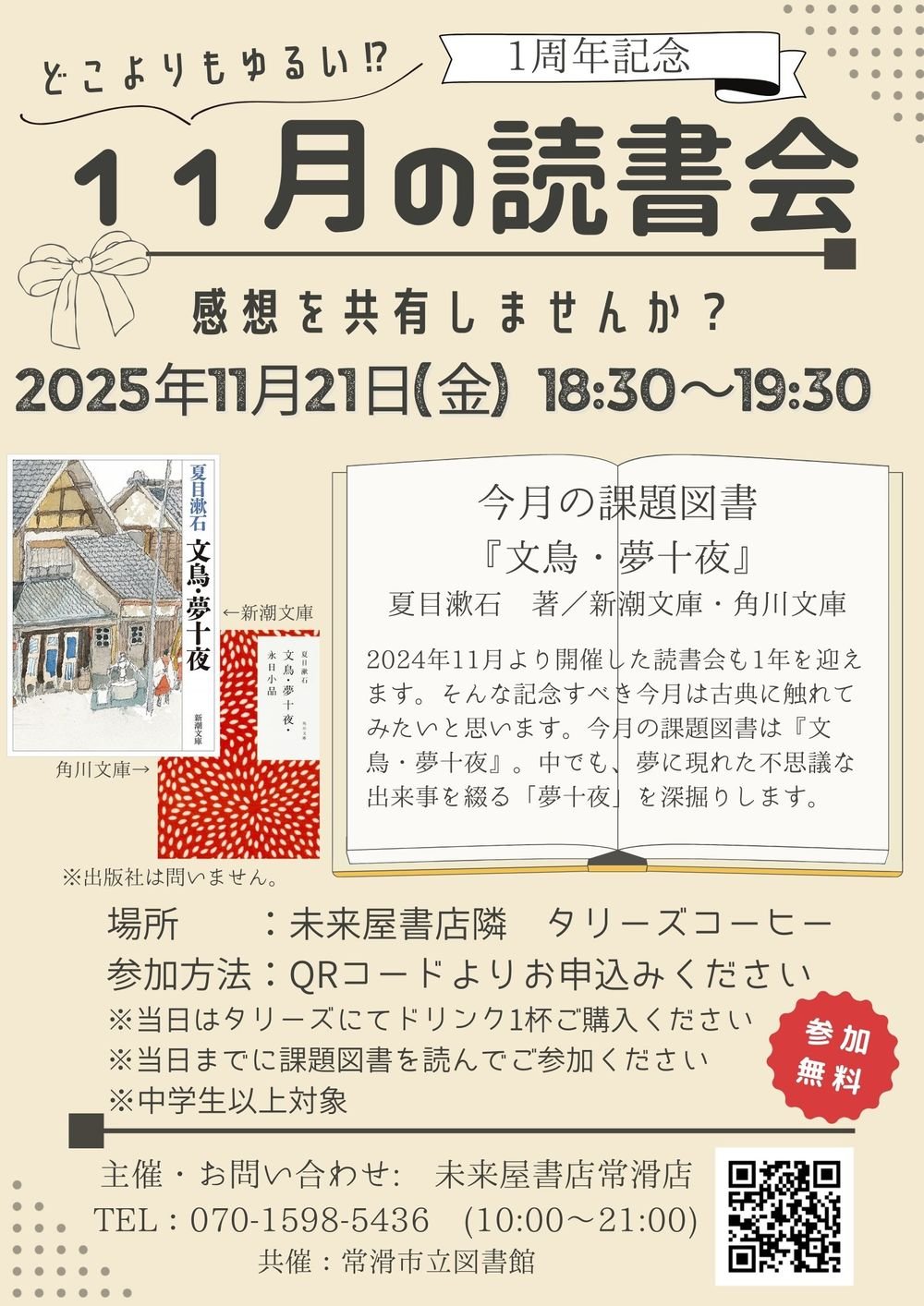 【未来屋書店常滑店】11月の読書会 投稿日: 2025年11月 1日 その他 開催期間:2025年11月21日 場所はイオンモール常滑店の未来屋書店です!お間違いないようお越しください。 前の記事 次の記事