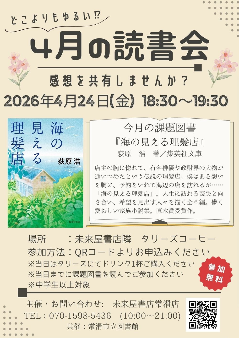 【未来屋書店常滑店】4月の読書会 投稿日: 2026年4月 1日 その他 開催期間:2026年4月24日 下記のURLから受付中です。tokoname-dokushokai0424.peatix.com 場所はイオンモール常滑店の未来屋書店です!お間違いないようお越しください。 前の記事