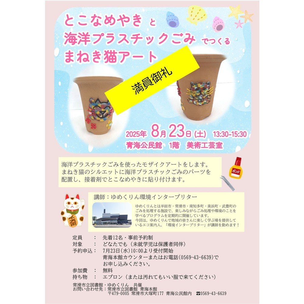 【ゆめくりん共催】とこなめやき と 海洋プラスチックごみでつくる まねき猫アート 投稿日: 2025年7月25日 青海本館 開催期間:2025年8月23日 定員に達しましたので、申し込みの受付は終了しました。ありがとうございます。 前の記事 次の記事