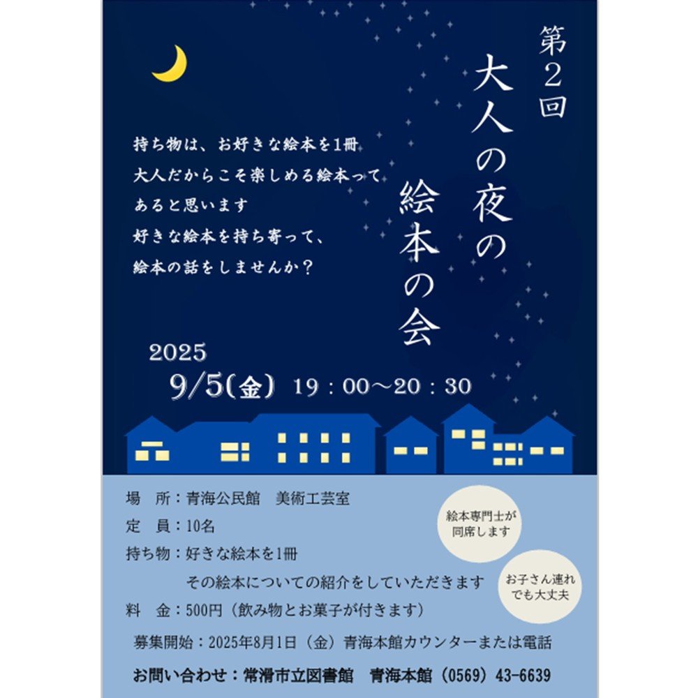 第2回 大人の夜の絵本の会 投稿日: 2025年8月 2日 青海本館 開催期間:2025年9月 5日 好きな絵本について語りませんか。お申し込みは青海本館カウンター、もしくは電話で受付中です!ぜひ、お申し込みください! 前の記事 次の記事
