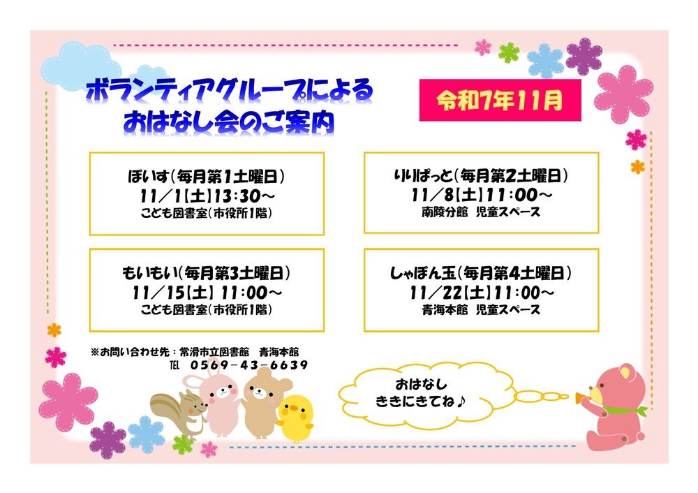 11月のおはなし会 投稿日: 2025年11月 1日 青海本館 南陵分館 こども図書室 開催期間:2025年11月 1日~2025年11月22日 ボランティアグループによるおはなし会を開催します。皆さまのお越しをお待ちしています。 前の記事 次の記事